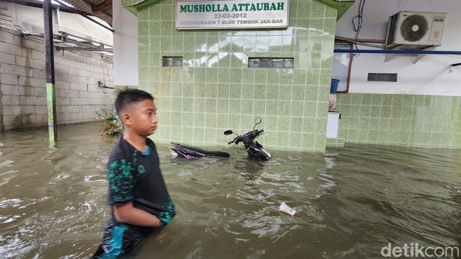 Jakarta Barat - Kawasan pemukiman di RT6/6 Kelurahan Cengkareng Barat direndam banjir. Hingga pukul 12.00 WIB, ketinggian air sekitar 70 cm hingga sepinggang orang dewasa.