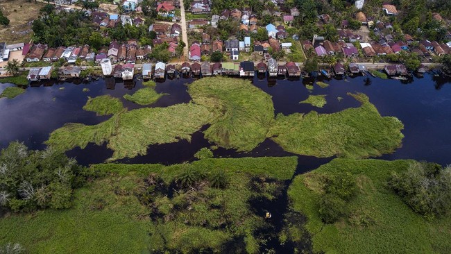 Jambi - Gulma menumpuk di Sungai Kumpeh, Muaro Jambi, Jambi,Senin (25/3/2024). Ini penampakannya.
