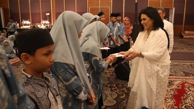 Ketua Umum DPP INSA Carmelita Hartoto dan Sekretaris Umum Darmansyah Tanamas memberikan santuan dalam acara INSA Berbagi dan Buka Puasa Bersama Anak Yatim di Jakarta, Rabu (27/3/2024).