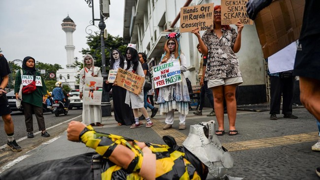 Bandung - Seniman Bandung menggelar aksi teatrikal di Jalan Asia Afrika, Bandung. Aksi ini dalam rangka solidaritas untuk Palestina.