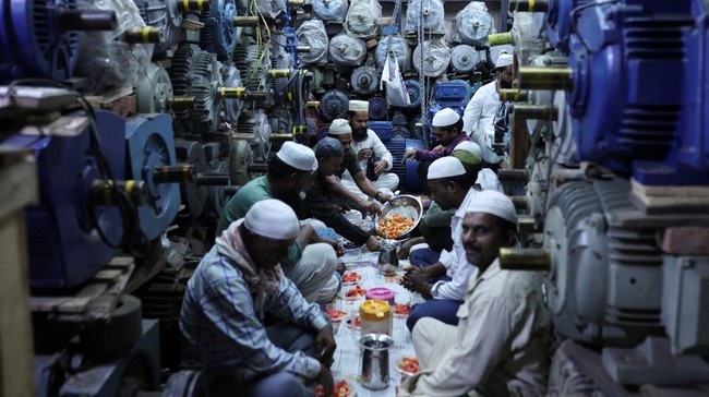 India - Ramadan dimanfaatkan sebagai momen kebersamaan para pedagang di India. Mereka buka puasa bersama di antara barang-barang dagangan.