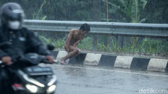 Jakarta - Seorang pria diduga Orang Dengan Gangguan Jiwa (ODGJ) terlihat di Jalan Pengairan 2, Margajaya, Bekasi. Pria itu mandi hujan dengan telanjang bulat.