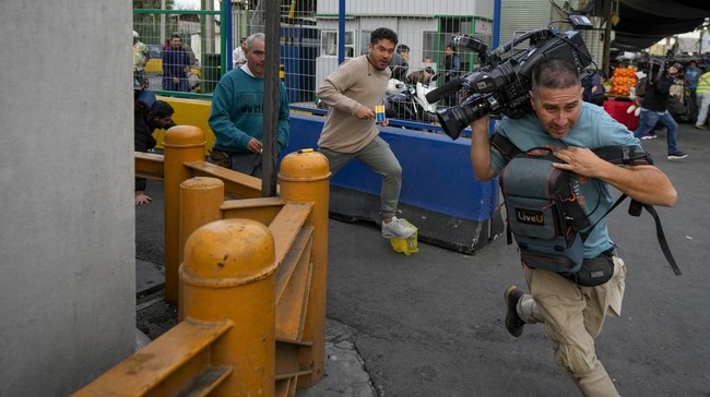 Jurnalis berlari keluar pasar grosir Lo Valledor setelah seorang wanita mengambil senjata penjaga keamanan dan menembakkannya di Santiago, Chile, Senin (1/4/2024).