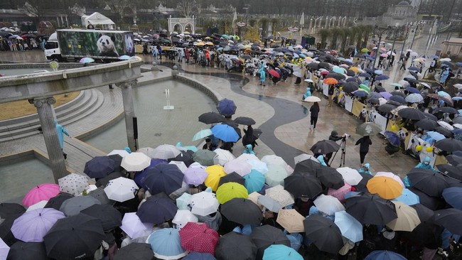 Korea Selatan - Masyarakat berkumpul di taman hiburan yang diguyur hujan di Korea Selatan untuk mengucapkan selamat tinggal kepada panda raksasa. Panda pulang ke China.