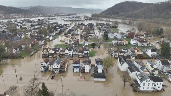 Rekaman drone yang dirilis oleh Departemen Pemadam Kebakaran Wheeling pada Rabu (3/4) dan Kamis (4/4) menunjukkan tingkat banjir dan kerusakan di Pulau Wheeling, Virginia Barat.