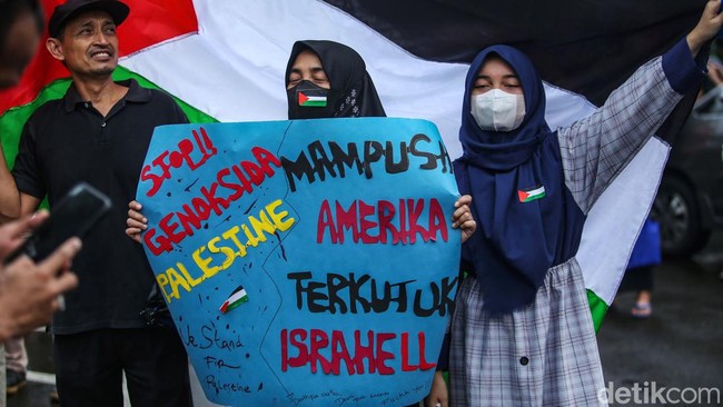 Jakarta - Massa menggelar demonstrasi bela Palestina di depan Kedubes Amerika Serikat, Jakarta. Mereka menyuarakan agar Palestina bebas dari penjajahan Israel.