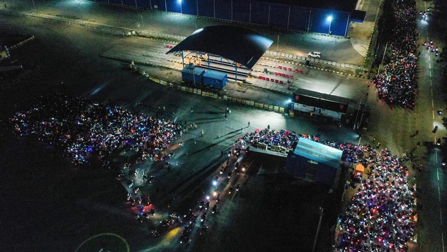 Cilegon - Pemudik motor memadati Pelabuhan Ciwandan, Cilegon, Banten, Sabtu (6/4/2024) dini hari. Begini penampakannya dari udara.