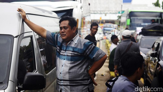 Banten - Macet panjang terjadi di exit Tol Merak, Banten, Sabtu (6/4/2024). Para pengendara yang tidak tahan berlama-lama di mobil memilih keluar dari kendaraannya.