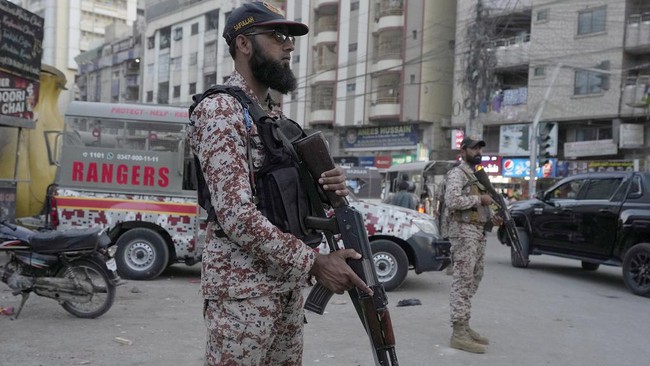 Tentara paramiliter berjaga di sepanjang sisi jalan untuk memastikan keamanan di Karachi, Pakistan, Rabu (10/4/2024).