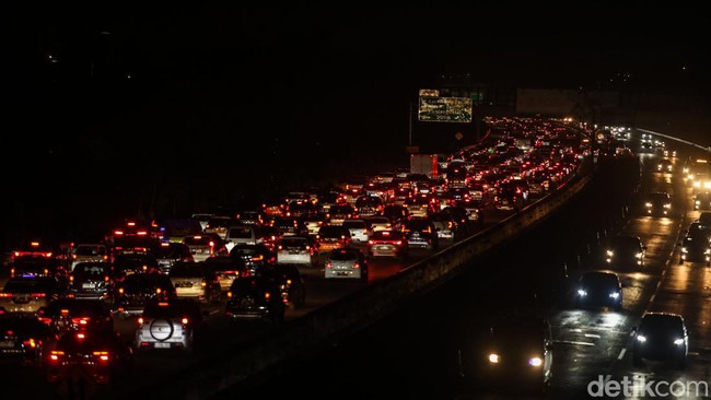 Jakarta - Ruas Tol Jakarta-Cikampek arah ke Jakarta mulai macet. Polisi menerapkan sistem rekayasa lalu lintas contraflow mulai dari Km 70 hingga 47.