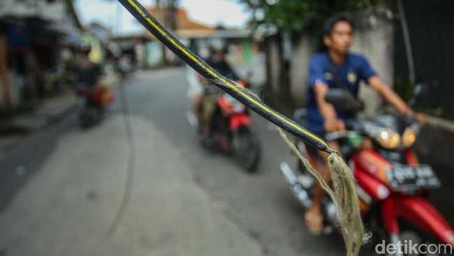 Depok - Kabal fiber optik terlihat putus dan menjuntai di sebuah jalan di Depok, Jawa Barat. Hal itu membuat warga resah.