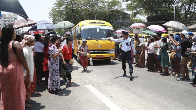 Sebuah bus yang membawa narapidana yang dibebaskan disambut oleh anggota keluarga dan rekannya setelah meninggalkan Penjara Insein di Yangon, Myanmar, Rabu (17/4/2024).