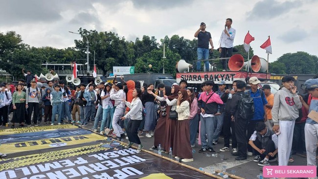 Jakarta - Massa pelajar menggelar demo di Patung Kuda, Jakarta, Jumat (19/4). Mereka meminta MK untuk tetap konsisten menjaga demokrasi.