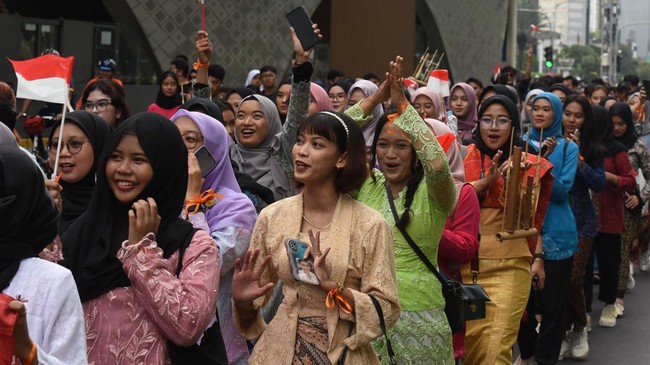 Anggota Komunitas Teman Baru bersama mahasiswa Universitas Terbuka JCC melakukan pawai dengan baju daerah saat memperingati Hari Kartini pada Hari Bebas Kendaraan Bermotor (HBKB) di kawasan Bundaran HI, Jakarta, Minggu (21/4/2024).