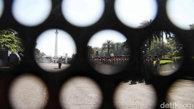Polri menggelar apel pengamanan sidang putusan sengketa Pilpres di kawasan Monas, Jakarta, Senin (22/4/2024).