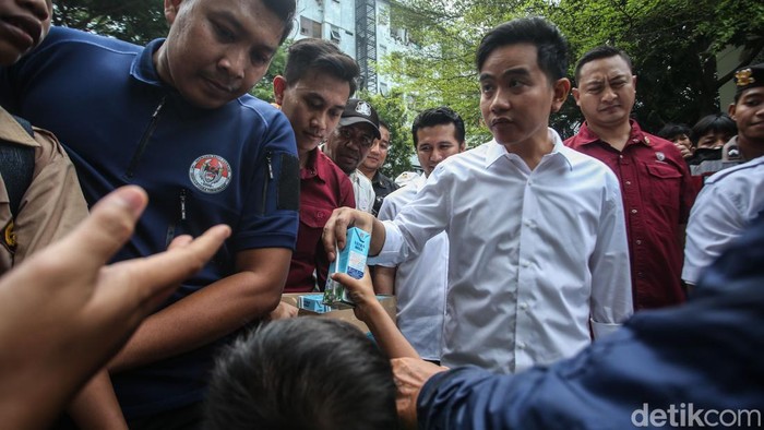 Tak ketinggalan Gibran turut membawa susu dan membagikannya secara langsung kepada anak-anak.