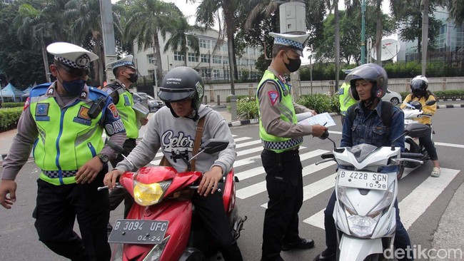 Jakarta - Razia kendaraan digelar di Bundaran HI, Jakarta. Sejumlah pemotor pun mendapat surat tilang manual.