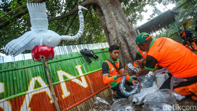 Jakarta - Petugas UPK Badan Air Kecamatan Penjaringan mengubah limbah botol plastik jadi patung soang. Patung soang itu diletakan di Taman Waduk Pluit untuk mengusir hama