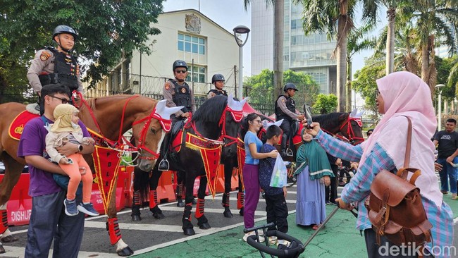 Jakarta - Kehadiran polisi berkuda di car free day (CFD) Jakarta menjadi perhatian anak-anak. Mereka berfoto dengan polisi dengan kuda tinggi besar tersebut.