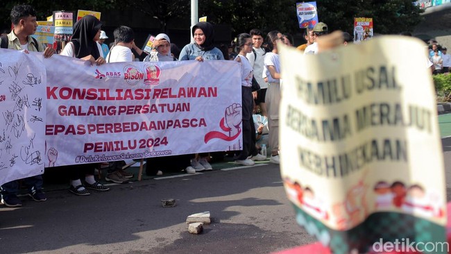 Jakarta - Sejumlah relawan lintas capres dan cawapres menggelar aksi di CFD Jakarta. Mereka menyerukan persatuan antar pendukung capres-cawapres usai Pemilu 2024.