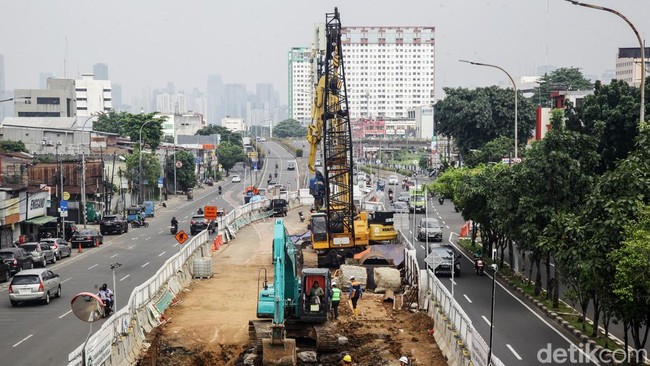 Jakarta - Proyek LRT Jakarta rute Velodrome-Manggarai sedang dikerjakan di Jalan Pramuka, Jakarta, Selasa (30/4). Proyek ini menyebabkan kemacetan di kawasan tersebut.