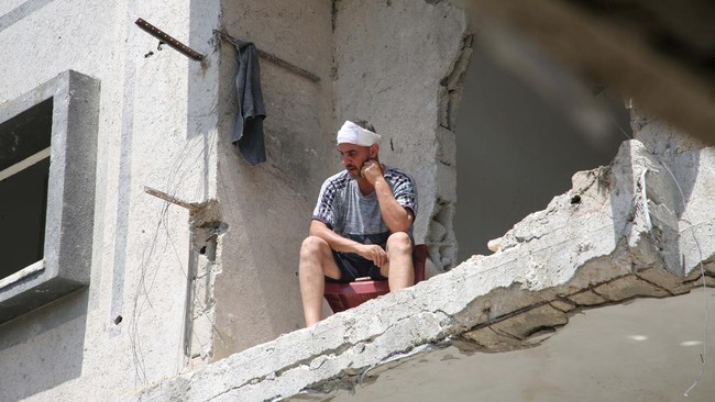 Gaza - Bangunan-bangunan di Gaza, Palestina, terus hancur akibat diserang Israel. Warga Gaza hanya bisa termenung melihat rumah-rumah mereka hancur.