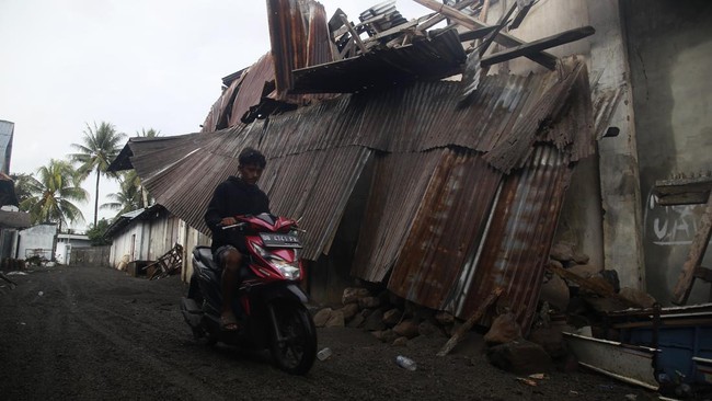 Pengendara melintas di depan rumah yang rusak akibat erupsi Gunung Ruang di Tagulandang, Kabupaten Kepulauan Sitaro, Sulawesi Utara, Kamis (2/5/2024).