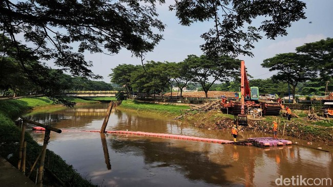 Jakarta - Sejumlah petugas melakukan aksi bersih-bersih sampah di Kali Pesanggrahan, Jakarta Selatan, Jumat (3/4). Kegiatan itu sebagai upaya untuk mengantisipasi banjir.