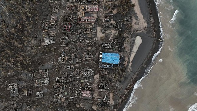 Foto udara kondisi permukiman warga yang rusak parah terdampak erupsi Gunung Ruang di Desa Laingpatehi Pulau Ruang, Kabupaten Kepulauan Sitaro, Sulawesi Utara, Jumat (3/5/2024).