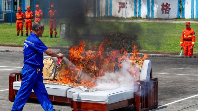 Seorang anggota mendemonstrasikan cara memadamkan api di Huangshan, Provinsi Anhui, China, Selasa (7/5/2024).