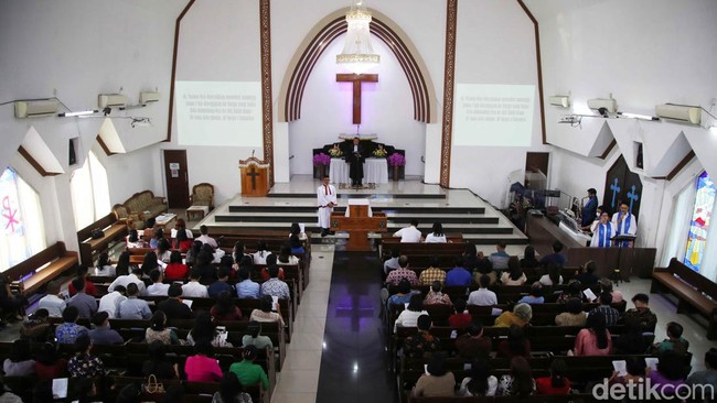 Jakarta - Umat Kristen menjalankan ibadah misa Kenaikan Yesus Kristus di Gereja Huria Kristen Batak Protestan (HKBP), Cilincing, Jakut. Ibadah berjalan khidmat.