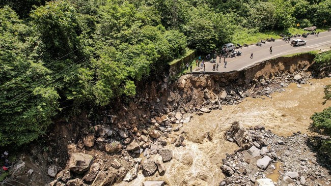 Foto udara kondisi jalan nasional yang putus di kawasan Silaiang, Tanah Datar, Sumatera Barat, Minggu (12/5/2024). Ruas jalan utama Padang - Bukittinggi via Padang Panjang tersebut putus akibat banjir bandang pada Sabtu (11/5) dan arus lalulintas terpaksa dialihkan ke sejumlah jalur alternatif. ANTARA FOTO/Beni Wijaya