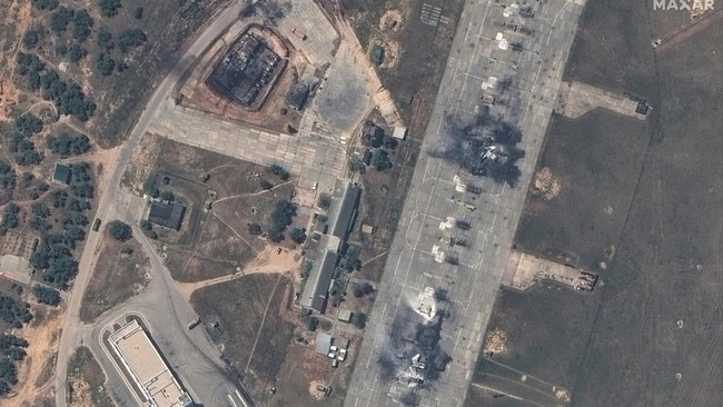 Krimea - Gambar satelit menunjukkan dampak serangan terhadap pangkalan udara Krimea. Gambar menunjukkan kerusakan fasilitas penyimpanan bahan bakar serta pesawat tempur.