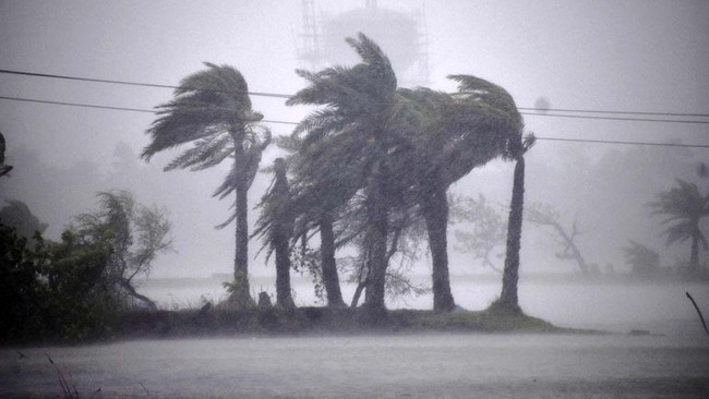 Sejumlah pohon berayun-ayun akibat diterjang topan Remal di Bakkhali, Benggala Barat, India, Senin (27/5/2024). AP Photo/Ashim Paul.