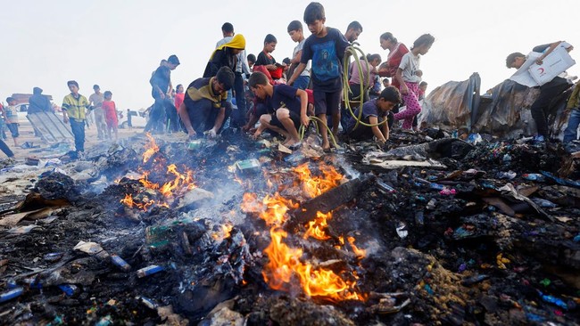 Warga Gaza Kais Sisa-sisa Makanan di Pengungsian Rafah yang Terbakar