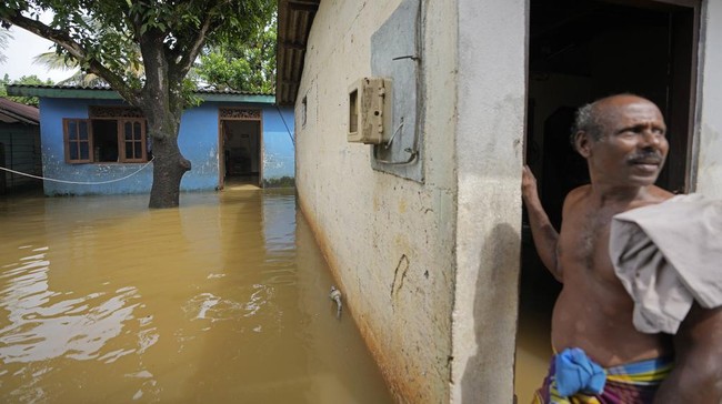 Seorang pria berdiri di luar rumahnya yang terendam banjir di Kelaniya, pinggiran kota Kolombo, Sri Lanka, Senin (3/6/2024).