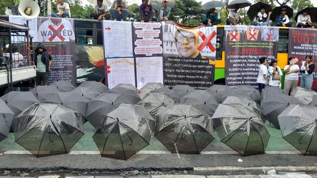 Ratusan karyawan PT Polo Ralph Lauren Indonesia membawa ratusan payung hitam saat berdemo di depan kantor Mahkamah Agung (MA), Jalan Medan Merdeka Utara, Jakarta Pusat, Senin (3/6/2024).