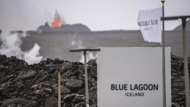 Pintu masuk Blue Lagoon saat gunung berapi meletus di latar belakang Grindavik, Islandia, Minggu (2/6/2024). Letusan pada hari Rabu (29/5) ini adalah yang kelima dan terkuat sejak sistem vulkanik di dekat Grindavik bangkit kembali pada bulan Desember setelah 800 tahun, mengeluarkan tingkat lava yang memecahkan rekor seiring dengan retakan yang bertambah panjang hingga 3,5 kilometer (2,1 mil).