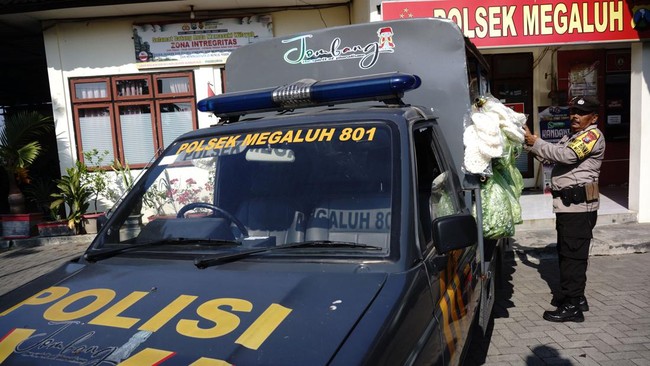 Anggota polisi menata sayuran di mobil patroli di Polsek Megaluh, Kabupaten Jombang, Jawa Timur, Jumat (7/6/2024).