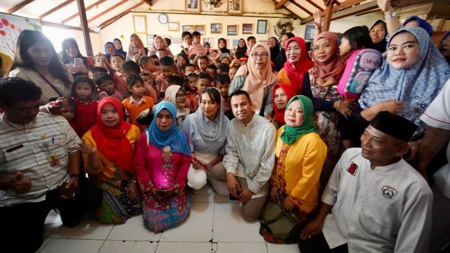 Jakarta - Ketua DPP PAN Zita Anjani bersama aktris Raffi Ahmad mengunjungi PAUD Harapan Bangsa. Kunjungan keduanya dalam rangka berbagi makan siang dan susu gratis.
