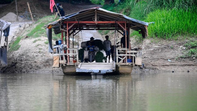 Warga menyeberangi sungai Ciujung di Pamarayan, Serang, Banten, menggunakan perahu eretan, Minggu (9/6/2024).