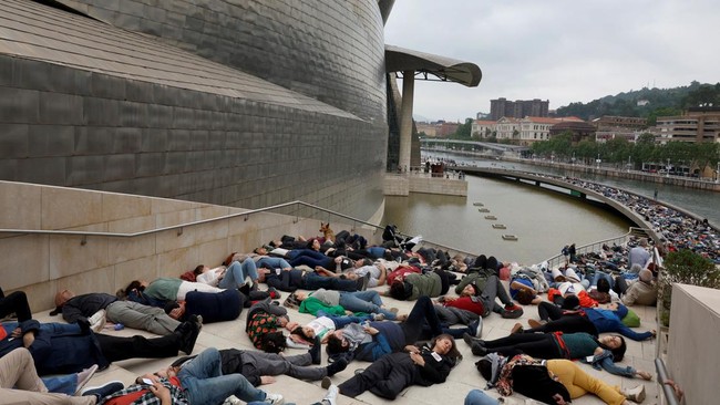 Para pengunjuk rasa berbaring di luar Museum seni modern Guggenheim Bilbao untuk meniru korban jiwa di Gaza, selama protes yang diselenggarakan oleh kolektif Gernika-Palestina dari wilayah Basque Spanyol, di tengah konflik Israel-Hamas, di Bilbao, Spanyol, Jumat (8/6/2024).