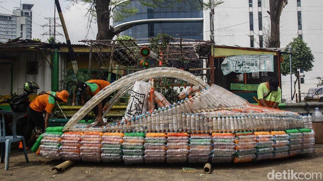 Jakarta - Botol plastik bekas dimanfaatkan petugas UPS Badan Air Jakarta untuk membuat sampan di kawasan Kwitang, Senen.