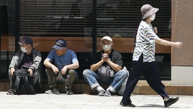 Sejumlah orang beristirahat di depan sebuah toko saat cuaca panas di Tokyo, Jepang, Rabu (12/6/2024).