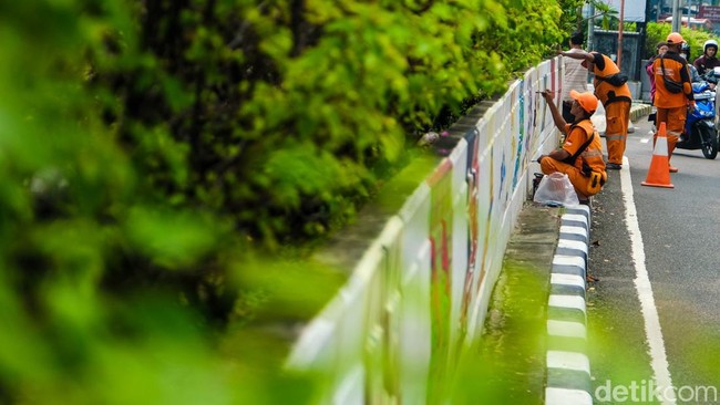 Petugas Penanganan Prasarana dan Sarana Umum (PPSU) Kelurahan Kebayoran Lama Utara alias pasukan oranye mengecat mural di dinding Underpass Arteri Pondok Indah, Jakarta, Rabu (12/6/2024).