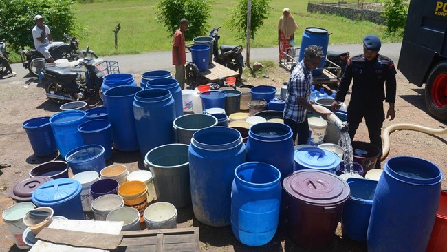 Aceh - Warga di wilayah Lhoknga, kabupaten Aceh Besar mengalami kekeringan. Lima unit mobil tangki dan satu unit mobil water cannon dikerahkan untuk memasok air.