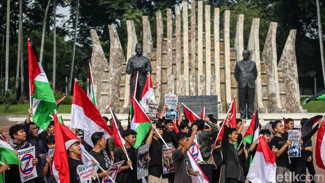 Jakarta - Puluhan orang melakukan aksi bela Palestina. "Free free Palestine" berkumandang di Tugu Proklamasi.