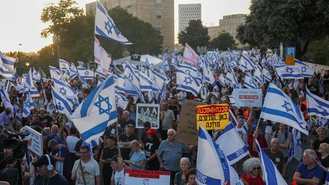 Yerusalem - Warga Israel kembali turun ke jalan di Yerusalem. Mereka meminta Benjamin Netanyahu mundur dan diakhirinya perang.