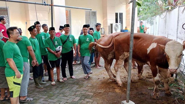 PT Biro Klasifikasi Indonesia (BKI) menyembelih hewan kurban di kantor PT BKI, Jakarta, pada Selasa (18/6). Tahun ini BKI berkurban sebanyak 4 ekor sapi dan 5 ekor kambing. Daging-daging kurban selanjutnya dibagikan kepada warga sekitar PT BKI, Masjid dan Pondok Pesantren.