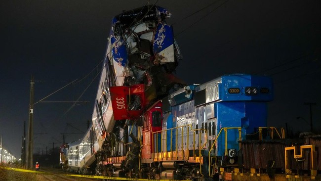 Tabrakan kereta yang sedang ujicoba dengan kereta kargo terjadi di San Bernardo, Santiago, Chile, Kamis (20/6/2024). AP Photo/Esteban Felix.